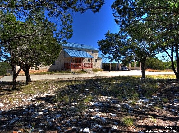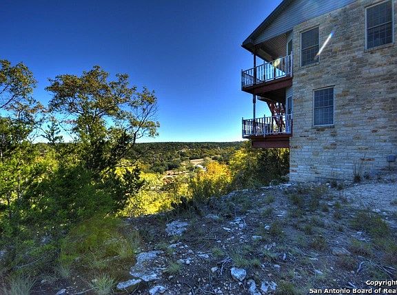 Exceptional views from this cliff-side, like-new home! Native Hill Country stone home w/raised seam metal roof, 18" I-beams support the decks overlooking the White Oak Creek. Kitchen has custom hickory cabinets, 5-burner propane stove, dbl-oven, granite, built-in wine rack. Each bedroom has ensuite bath, closets w/built-ins. MB 1 has fp & jetted tub w/view. MB 2 has fp, dbl-head shower & private deck w/view. Paved 3-car + RV parking, w/full hookups. Wildlife, hunting, NO CITY TAXES & VIEWS!