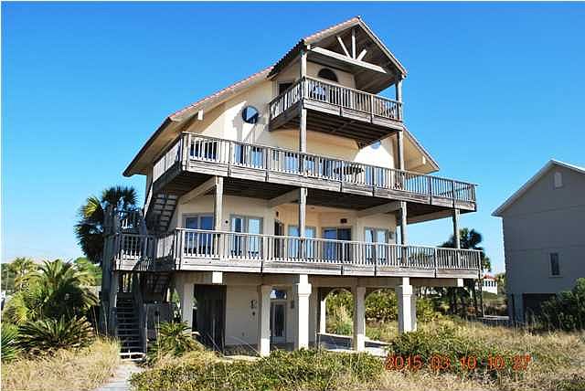 Custom Beach front home on one acre in St. George Island Plantation. Built by William Solburg, the Main living area on 2nd floor has open kitchen with large island/breakfast bar, dining area and living space overlooking the Gulf of Mexico. 1st Floor has 3 Bedrooms and 2 full baths. Loft on 3rd Floor also has full bath and could be used as a 2nd Master BR. Elevator from ground floor entrance to all levels. Large decks on Gulf side of home to enjoy endless views.