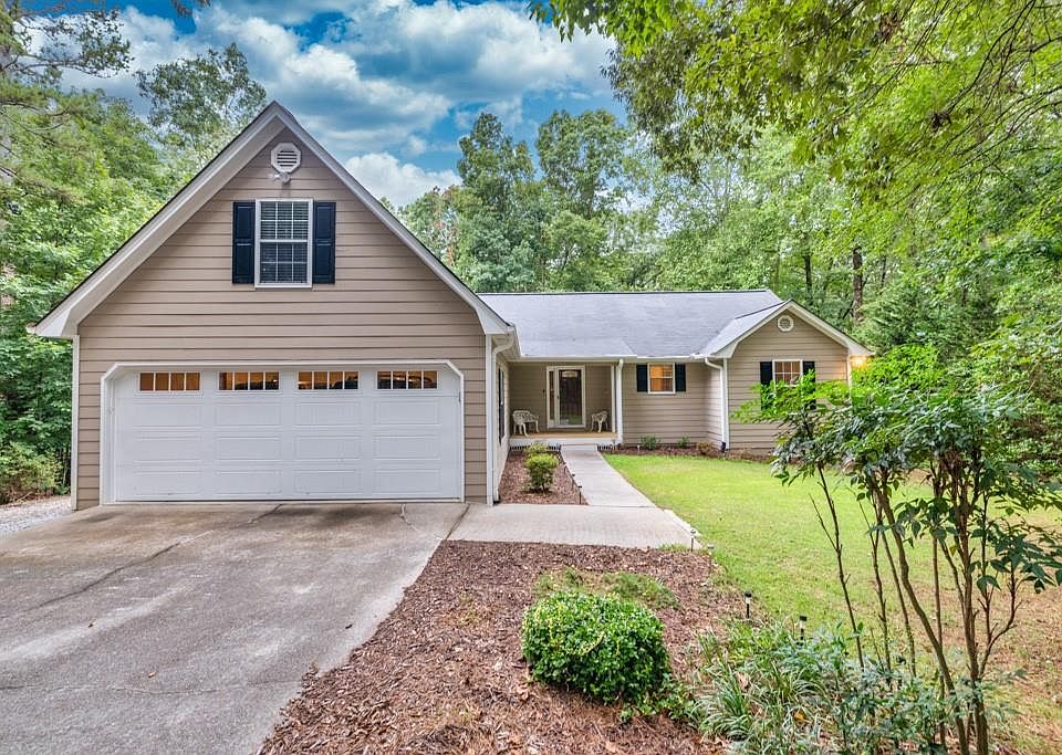 Your secluded retreat awaits! This well-maintained, move-in-ready 3-bedroom, 3-bathroom Ranch Home with low-maintenance concrete siding on a full finished basement sits on a quiet, wooded 1.5-acre lot teeming with nature. As you turn into the private driveway, you'll appreciate the seclusion and notice graded areas for additional parking. The cozy covered front porch invites you into an inviting family room featuring cathedral ceilings with exposed beams and a brick fireplace. The space flows into an eat-in kitchen with ample cabinets for storage, granite countertops, a breakfast bar, and a spacious dining area. Double doors lead to an extra-large screened porch and deck, extending the width of the home. The primary suite, just past the kitchen, has a private door to the screened porch, twin walk-in closets, and an en-suite bath with dual vanities, a separate shower & jetted garden tub. Two secondary bedrooms have walk-in closets and share a roomy bathroom. A large laundry room is just off the kitchen. The two-car garage is deep enough for even the largest vehicles, and the attic space above is decked for storage. The finished basement adds significant living space, with a second fireplace in the spacious rec/bonus/flex room and full bathroom, plus an oversized heated and cooled workshop/garage. Walk out of the basement to a patio beneath the screened porch & deck, another spot to relax & enjoy your backyard haven. A few steps into the backyard lead you to a firepit and gathering area, where deer and various birds are frequent visitors. Whether you're seeking a private wildlife sanctuary, dreaming of establishing your own homestead, or downsizing/rightsizing for peace & quiet, it's all here. Plus close proximity to parks, schools, shopping, and easy access to I-85, this home offers the best of both worlds - peaceful seclusion and modern convenience. Call today to schedule a tour of this rare gem, it won't last!