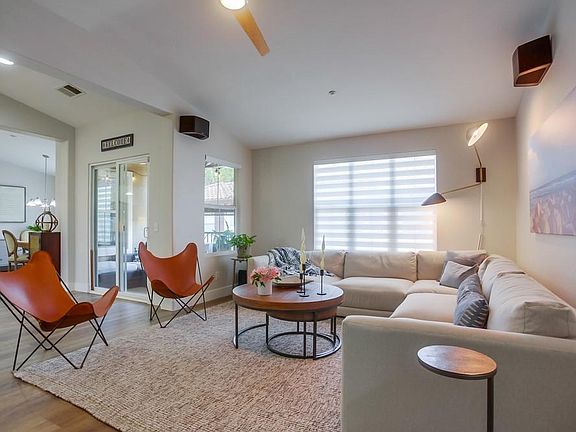 The single level, open floor plan has vaulted ceilings and lots of light. The kitchen is the heart of the home, with new cabinetry, soft close drawers, custom hardware, quartzite countertops, stainless steel appliances, recessed lighting, and an eat-at island. The kitchen leads nicely into the dining room, living room, and outdoor balcony. The balcony has space for outdoor furniture and a shade for privacy. Custom window coverings in the living areas are motorized and programmable.