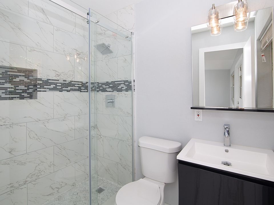 Unique backsplashPrivate backyardQuartz countertopsSubway tilesModern bathroomPorcelain floorsStainless steel appliances