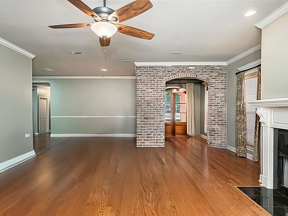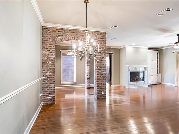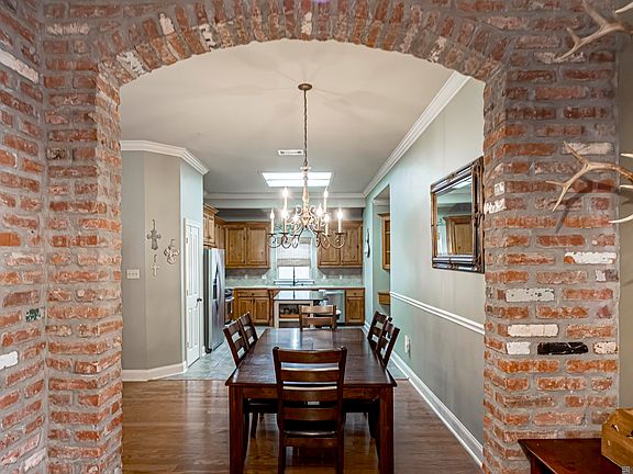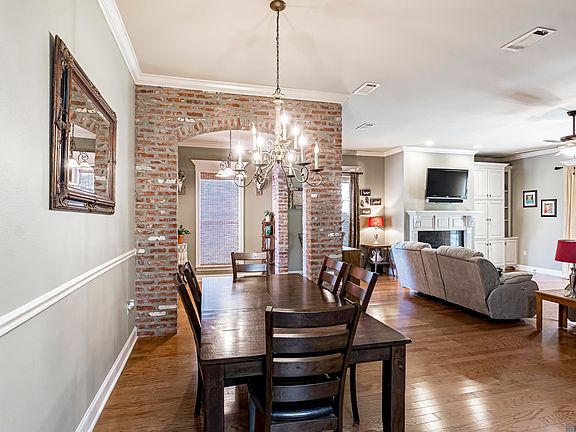 Walk to Water! Roof is only 3 years old! Motivated sellers! Charming and spacious 3 Bed, 2 Bath Family Home in Pointe South subdivision! This inviting home offers a blend of elegance and functionality. Upon entry, you'll notice the open-concept living and dining area, complete with hardwood floors, a cozy, gas fireplace, and built-in cabinetry. The brick accent wall in the foyer provides a touch of rustic charm. The kitchen features cypress cabinetry, a large island with granite countertops, tile countertops, and modern stainless-steel appliances. The adjacent dining area is perfect for both formal and casual meals. The primary bedroom is located in the back wing of the home and features plush carpeting, an en-suite bath, and an adjacent home office area perfect for remote work or study. The primary bathroom is outfitted with dual vanities, a large jetted tub, and a separate shower, providing a luxurious spa-like experience. The large walk-in closet offers ample space for storage with custom shelving. The additional bedrooms are located in the front, right wing of the home. Both bedrooms have walk in closets and share a full bathroom. The backyard features a covered patio ideal for outdoor entertaining, with views of the expansive green lawn that backs up to a scenic wood line, providing privacy and tranquility. Enjoy lush landscaping with mature trees that provide shade and curb appeal. The driveway leads to a two-car garage, and the inviting front entryway adds to the overall welcoming feel of the home. Community pool and fishing ponds! Quick walk to the water!