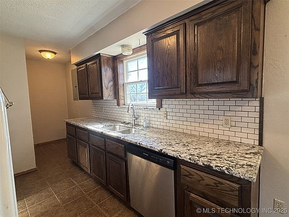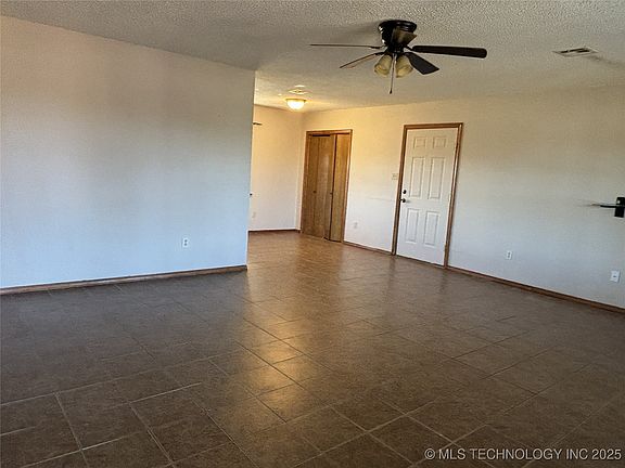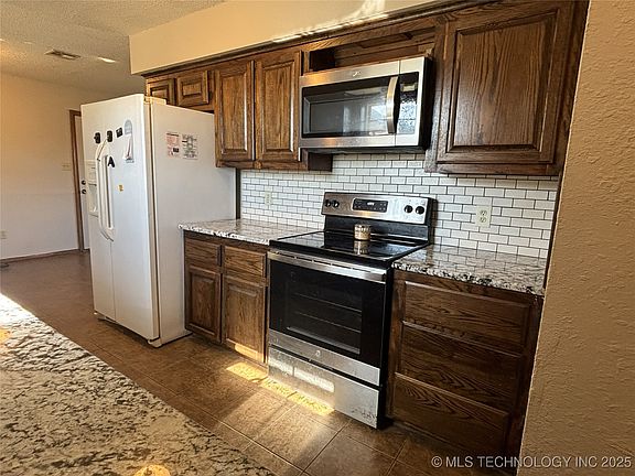 This cute brick 2 bedroom, 2 full bath homes has a metal roof and sits on 1 acre in the Morris School District. Location is secluded and just 3 miles from US 75 off Hwy 62, and bordered by pasture on 2 sides. The home has updated windows, tile flooring throughout and 2 full baths along with an office space that overlooks the front yard. The primary bedroom has 2 walk in closets and a private full bath. The kitchen has granite countertops and includes a dishwasher and built in microwave. Washer dryer hookups are in the single car attached garage. The front entry way is covered and the back patio is covered. The back yard is fenced and has a good sized metal storage building.