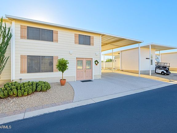 Looking for more than just a house? You want a place where life feels easy, neighbors feel like friends, and every day comes with options — not hassles. This site-built Happy Trails home delivers. Freshly painted, professionally cleaned, and move-in ready with newer solar, a main-level primary suite, ¾ bath, laundry, kitchen, and living area. Upstairs, two versatile rooms adapt for guests, office, hobbies, or a home gym. Outside, a covered RV port fits most rigs with plenty of parking and space to entertain or relax under Arizona skies. With owned land (not leased) and low-maintenance living, this home is a smart investment as well as a welcoming retreat. All within a premier 55+ gated community offering resort-style amenities, activities, and a one-of-a-kind lifestyle.