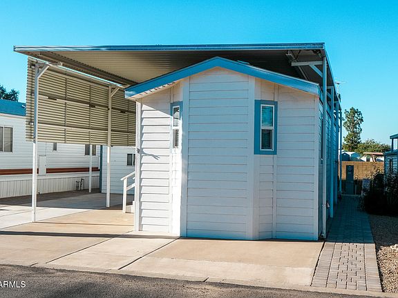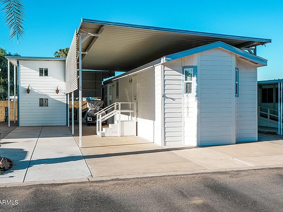 Thinking about spending your winters in Arizona? This 2022 singlewide lets you own your land with no lot rent inside Happy Trails Resort, one of the most active 55+ communities in Surprise. It backs to a privacy wall for quiet mornings and shaded afternoons. Inside, you'll find an open floor plan with a comfortable living area, large bedroom, and step-in shower. The kitchen includes newer appliances, and the home has central A/C and easy-care finishes throughout. There's ample parking plus a storage shed with washer and dryer. Low HOA fees include water, sewer, trash, and amenities. Enjoy pickleball, tennis, pools, spas, golf, a fitness center, bar & grill, and endless activities—all just a short golf cart ride away.