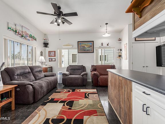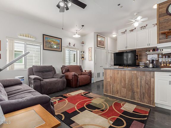 Enjoy resort style living in 55+ Happy Trails RV Resort! OWNED SOLAR! YES, OWNED. NO LAND LEASE either. You own your lot. This home is an ENTERTAINER'S DREAM with wet bar and kitchenette area in living room. Combined with a HUGE front porch there is plenty of room for guests to spread out. NEW HVAC 2017 The kitchen is very well set up and opens to a well-sized dining area with lots of windows for natural light. Split floor plan with 2 beds/ 2 baths and vaulted ceilings so you never feel closed in. There is a 2-story shed with loads of storage. SEE DOCUMENTS TAB for list of upgrades including a whole house water treatment system. This gated, 55+ community offers an array of amenities for an active and social lifestyle: pools, fitness center CLICK MORE tennis and pickleball courts, golf, wood work shop, arts and crafts, and more! This home is beautiful and you will LOVE living in Happy Trails Resort. SLEEPER SOFA is queen size (2nd bedroom) and conveys with home. Front porch has newer crank roller shades. All the TVs convey. Laundry conveys.
