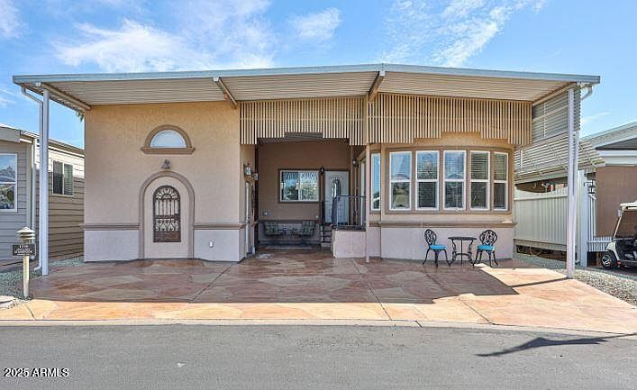Upgraded 1BD/1.75 BA park model, recently added Arizona Room by Ernie Young—well known for creating beautiful additions in Happy Trails. The AZ room features built-in shelving, a remote-controlled fireplace, and tons of natural light. Appliances & fixtures have been updated for a new home and move-in-ready feel. Detached casita comes with laundry & a private water closet & shower. A very spacious entertainment and lounging area, perfect for having company over or just relaxing. Enough parking on newer seal coated, stamped and colored spots. Some furniture & accessories included. Resort living with pickleball, pools, heated spa, onsite Bar & Grill, golf and endless social events. Lot ownership included!