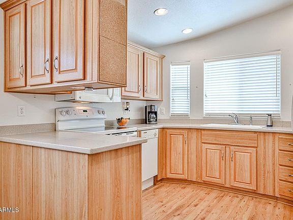 Looking for easy, turn-key living with no surprises? This spotless 1,092 sq ft custom park model in Happy Trails delivers. All on one level, it offers 2 bedrooms, 2 baths, an Arizona Room, and an upgraded kitchen with Corian counters, white appliances, and generous storage. Convenience is built in with interior laundry, full-size washer/dryer, and 2 new energy-efficient heat pumps. Outside, enjoy ample parking, a storage shed, and a large covered patio easily enclosed for pets or entertaining. With owned land and low HOA dues that include water, sewer, trash, and resort amenities, you'll have predictable costs and an active lifestyle—pickleball, pools, spa, fitness, dining, and dozens of clubs. Perfect for seasonal escapes or year-round comfort in Surprise, AZ.