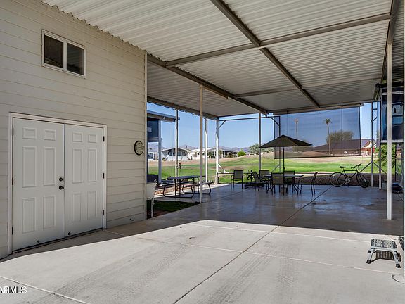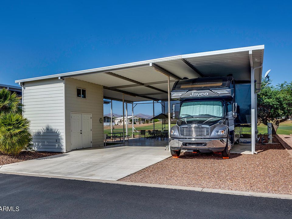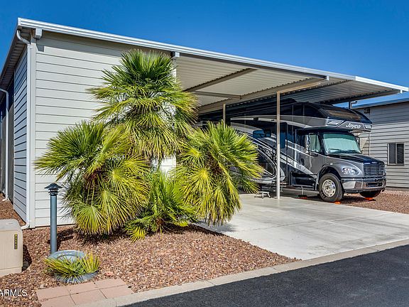 Happy Trails Lot 1303 is on Pat Brady and the Golf Course and over looks the Great Eagle 14th green. Beautiful views including the Whitetank Mountains. Plenty of elbow room on this 3125 square foot lot with full Awning to shade your RV and lots of shaded outdoor living space. Sun shades and screens. Shed is ready customize to your taste and has pull down access to upstairs storage loft. Camp on this lot seasonally, rent it out or build your dream Casita Home. Possibilities abound. You own the land and the affordable HOA includes garbage service and unmetered water. Happy Trails Resort is a very lively 55+ Gated Community highlighted by Pickleball & Tennis Courts, Multiple Pools and Spas, Fitness Center, a Host of Craft Clubs, and Restaurant. Lots of Live Entertainment and tons of get-togethers mean there's never a dull moment. Come see what the Happy Trails Lifestyle is all about!