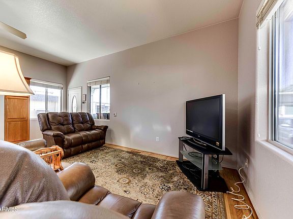 An impressive custom built Arizona Home with an RV port is a buyers dream. The attention to quality is evident when you enter the warm and inviting living area from the charming front porch. Fully furnished with matching Lazy Boy chairs and sofa makes this turn key unit ready to move in. The beautiful oak cabinets set the tone for the fully equipped functional kitchen and compliment the quality wood oak flooring throughout. A large bedroom with walk in closet and adjoining bathroom makes this the perfect place. Recently installed HVAC unit too! Stunning pavers surround the entire home creating a massive back patio area with lush greenery for a perfect outdoor retreat. Large RV's welcome.