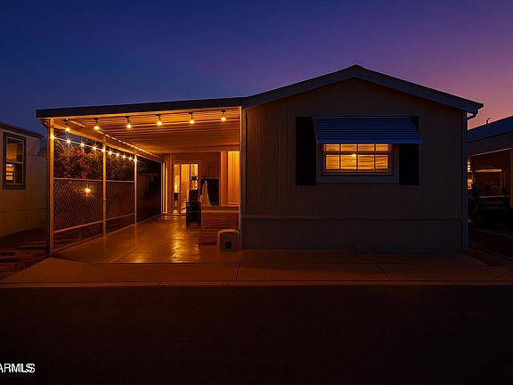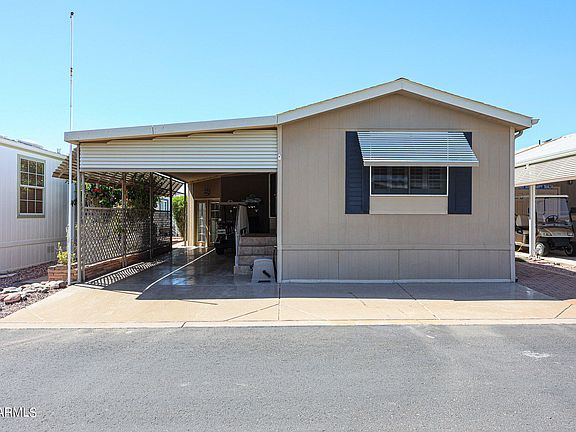 Beautifully maintained single-wide home in Happy Trails Resort, a vibrant 55+ community offering pickleball, golf, and resort-style amenities and groups. This 2-bedroom, 1.5-bath home is tastefully decorated and move-in ready! The open kitchen provides ample storage and counter space, with durable laminate flooring throughout. The main bedroom features cozy carpet and a spacious closet, while the second bedroom includes a space-saving Murphy bed, perfect for guests or a home office. Ceiling fans in every room, plantation shutters, and sunscreens on most windows enhance comfort and privacy. Undercover parking and a shed with a full-size W/D add convenience. This home is deep cleaned and ready for its new owner. Ideal for a seasonal retreat or full-time living.