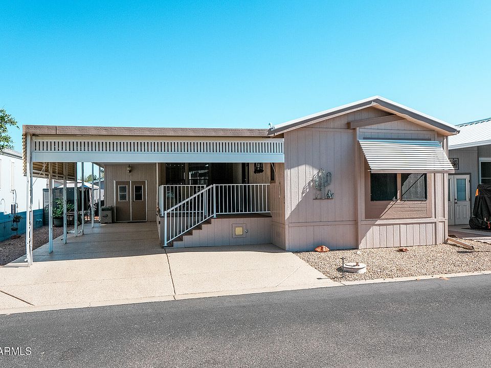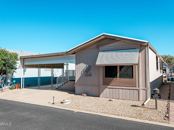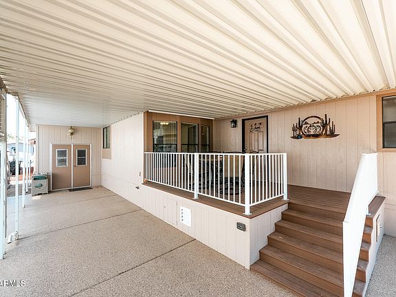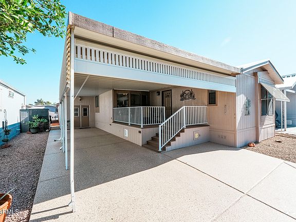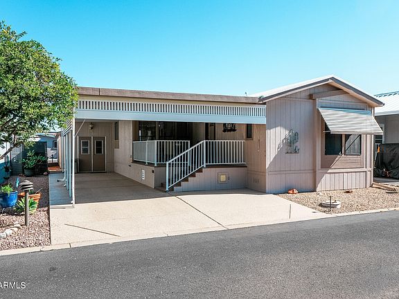 Bright, inviting, and designed for easy resort living, this 2BD/2BA Snugglewide blends comfort, function, and charm. Enjoy an open feel with neutral colors, laminate flooring, and tile in the updated kitchen plus extra W/D hookups in the second pantry. The split layout offers privacy, with a main suite featuring a walk-in closet and 3/4 bath, and a guest room beside a full bath. Relax on the private covered front deck or start your day on the cozy back deck with sunrise views. Covered parking, newer AC, and a shed with W/D and golf cart (included). Furniture, linens, and kitchen items stay—making this home truly turn-key. In Happy Trails, you own your lot (no lot rent), and the low HOA covers water, sewer, trash, and resort amenities. Perfect for year-round living or a snowbird escape.
