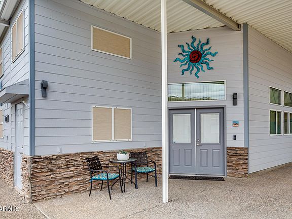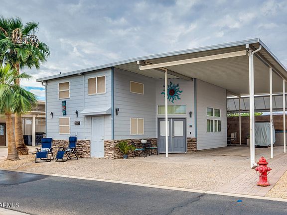 Complete with full hook-ups, a fully equipped kitchen, a spacious living area, & a private bedroom with ample storage. Enjoy relaxing mornings on your private, covered patio or host friends for an evening BBQ. Large back patio slider opens home to the outdoors for perfect AZ outdoor living. High efficiency HVAC new in 2019, 30gal W.H., well insulated, back patio louvers. Move-in ready with tasteful, comfortable furnishings throughout. Many items convey with the sale! Happy Trails RV Resort is a 55+ active adult gated community featuring an on-site restaurant, post office, low HOA dues, & NO LAND LEASE!. Experience Arizona living and a vibrant social scene today!