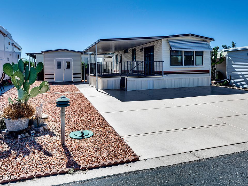 Happy Trails Park Model Lot 212: New to Market! This home is perfect for a primary residence or a winter time getaway. An open, well lit living room in the front of the home makes for cozy living. Smartly laid out kitchen and dining add to the livablity. The bedroom boasts tons of closet and built in drawers. The large covered porch makes a great outdoor living space. Separate shed will accomidate a golf cart and provide plenty of extra storage. HVAC system dated 2019. Happy Trails Resort is a very lively 55+ Gated Community highlighted by Pickleball & Tennis Courts, Multiple Pools and Spas, Fitness Center, a Host of Craft Clubs, and Restaurant. Lots of Live Entertainment and tons of get-togethers mean there's never a dull moment. Come see what the Happy Trails Lifestyle is all about!
