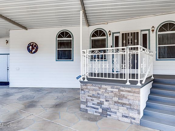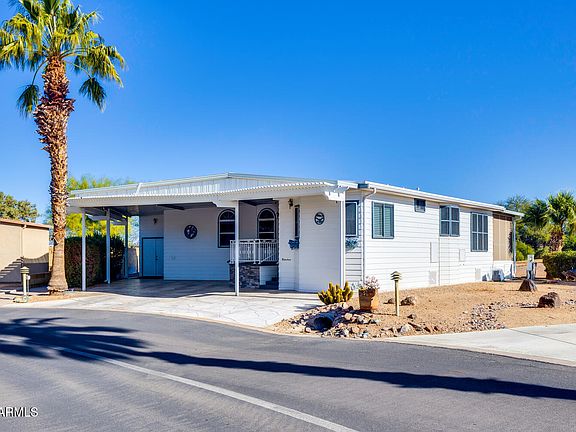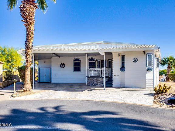 Experience tranquility in sunny Arizona as you enjoy breathtaking sunrises over the 12th hole of The Great Eagle Golf Course from your multi-season Arizona room. This meticulously maintained home in Happy Trails RV Resort located in Surprise offers a welcoming covered front porch, a spacious living room, and a large master suite, a guest bedroom, two bathrooms, an indoor laundry area, and a remodeled kitchen with elegant quartzite countertops with newer appliances. Additional features include newer water heaters, a reverse osmosis system, a water softening system, a reconditioned swamp cooler, TPO roofing over the shingles, and a newer AC/heat pump. The workshop/shed is ideal for storing your golf cart or working on projects. Don't miss your chance to make this stunning home yours! Experience tranquility in sunny Arizona as you enjoy breathtaking sunrises over the 12th hole of The Great Eagle Golf Course from your multi-season Arizona room. This meticulously maintained home in Happy Trails RV Resort located on lot #349 offers a welcoming covered front porch, a spacious living room, and a large master suite, a guest bedroom, two bathrooms, an indoor laundry area, and a remodeled kitchen with elegant quartzite countertops with newer appliances. Additional features include new soft water heaters, a reverse osmosis system, a water softening system, a reconditioned swamp cooler, TPO roofing over the shingles, and a newer AC/heat pump. The workshop/shed is ideal for storing your golf cart or working on projects. Don't miss your chance to make this stunning home yours!