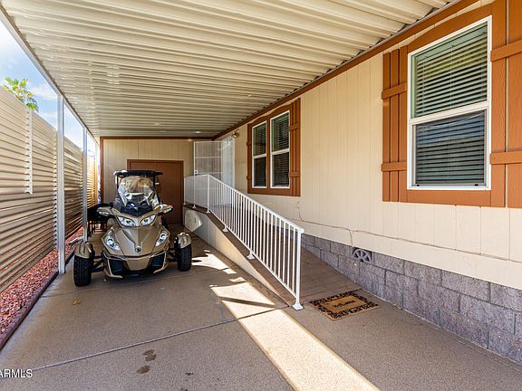 THIS HOME IS IN VERY GOOD CONDITION.. THERE IS. PARKING FOR 1 CAR & A GOLF CART ON COVERED CARPORT. RAMP FOR WHEELCHAIR or any Handicapped issue. There is a storage shed at end of carport. Open Living Room open to Dining & Kitchen. Kitchen has newer stainless steel appliances within the last 2 years. Nice light wood .cabinets .A great BONUS is an extra room for office or crafts, etc.. Located in wonderful park with land. Park has a multitude of activities. & amenities (list available) 4 pools, pickle ball, shuffleboard, 4 tennis courts, laundry facility, Performing Arts Center & more. There is a sleep number bed in the master & master bath has a walk-in shower. Solar lease is $105/month.