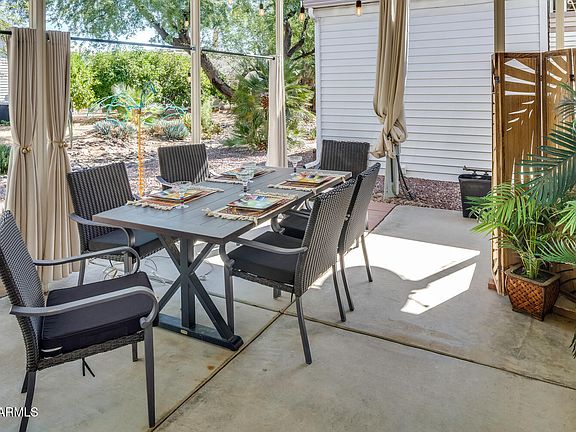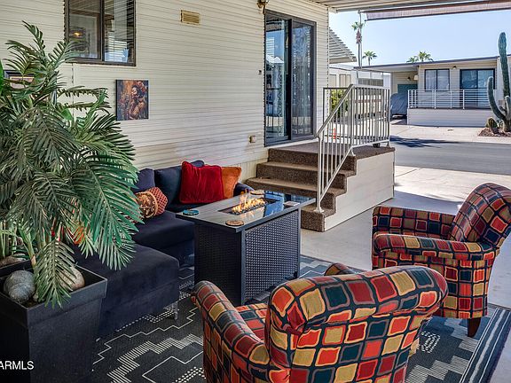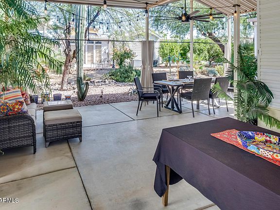 GORGEOUS GREENBELT LOT!! Enjoy the exciting Happy Trails Resort lifestyle in this comfortable Cavco Park Model on an owned lot in this unique guard-gated community. Offered fully furnished inside and out, right down to the linens and dishes! Full of natural light from the skylight and bay windows. The bathroom has a walk-in shower and linen closet. The finished shed has desk space, storage and a full-sized dryer and washer. The full awning provides covered parking and shade for you and your guests. It's only a short walk from this quiet interior location to the bustling Town Center or take your golf cart with updated battery system that's included with this home. Happy Trails boasts resort-style amenities and over 100 great Clubs, but still has that small-town, neighbor-friendly vibe.