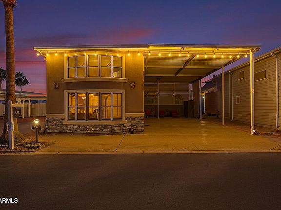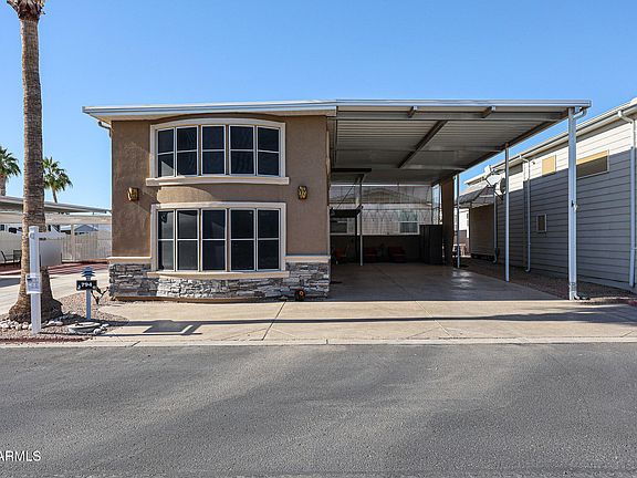 Looking for a home that blends RV living with true comfort? At Happy Trails Resort, this custom two-story delivers nearly 1,000 sq ft of thoughtfully designed space plus a covered RV port for easy access. Inside, a 1-bedroom + den, 1.5-bath layout features granite countertops, walk-in pantry, and abundant storage. The versatile den adapts for office, crafts, or guests. Step outside to an outdoor entertainment retreat with kitchen, fridge, seating, built-in walls, remote wind screens, and ceiling heater — perfect for year-round enjoyment. Fully turn-key and ready to welcome you, with owned land and low HOA dues that include water, sewer, trash, and resort amenities, this property makes RV life simple, social, and elevated in one of Arizona's most active 55+ gated communities.