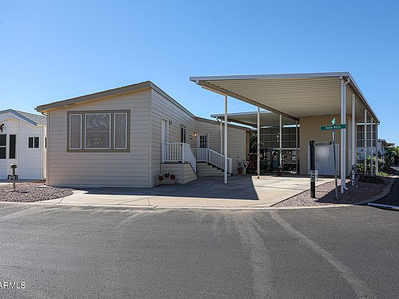 Ready for an epic upgrade to your Arizona lifestyle? This 2020, 944 sq ft corner-lot home combines solar power, smart design, and modern updates to save you money and time. With 2 bedrooms, 1.75 baths, new flooring, and thoughtful touches like two pantries, slide-out drawers, and a stackable washer/dryer, it's designed for comfort. Outdoors, enjoy a huge covered patio, extended carport, and lofted storage shed — plenty of room for hobbies, gear, or guests. At Happy Trails Resort, you own your lot (no rent) and enjoy low monthly HOA fees that include water, sewer, trash, plus access to pools, pickleball, golf, fitness, clubs, and nonstop activities. This home is move-in ready with modern comforts and an active community that makes every day feel like vacation.