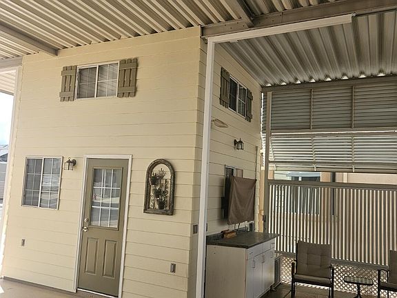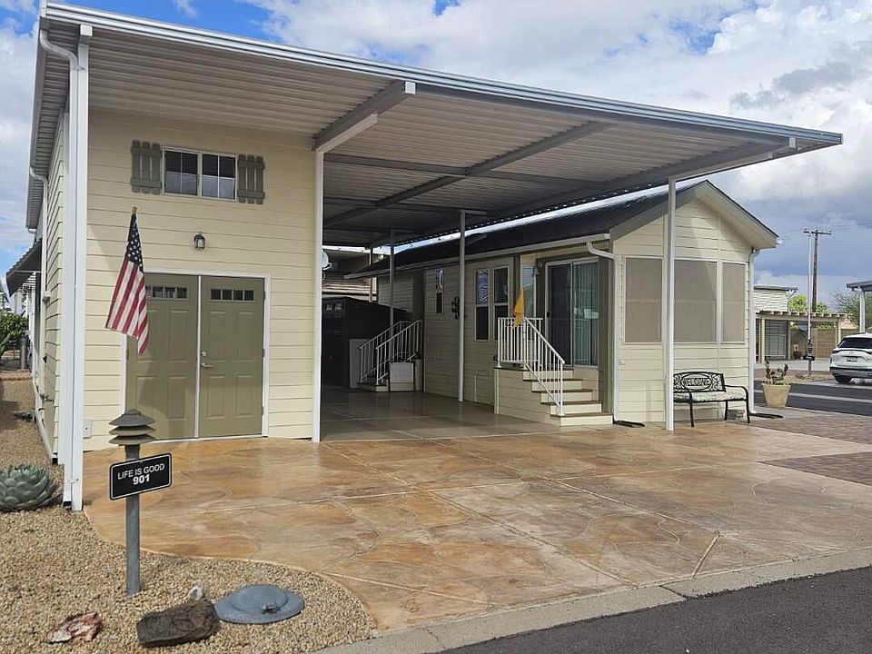 Located in fabulous Happy Trails Resort. 2013 Cavco, 1BR/1BA Park Model, Lot #901. This is an amazing oversized, covered corner lot - great for relaxing and entertaining. You own the property; no land lease! Low HOA. Interior is partially furnished as shown. Home updated in 2024/2025 with full tile shower remodel w/glass enclosure, laminate plank flooring throughout, new baseboard/crown molding, stainless steel appliances, garbage disposal, stainless sink/faucet, and high-rise toilet. New ceiling fans in LR and BR as well as fresh interior and exterior paint. Sky lights and vaulted ceilings make this home light and bright. Vibrant 55+ community with endless activities: pickleball, pools, spas, clubs. THIS DESIRABLE CORNER LOT WON'T LAST LONG, SO COME SEE TODAY!! Oversized lot is north/south facing and has a 2-story casita with LG stack washer & dryer, residential refrigerator, a mini-split A/C (all added in 2024), cabinet w/sink, and large storage cabinet. Fully finished upper level includes hot water tank and lots of storage. Outside has epoxy floors, pavers font/side and plant irrigation. All patio furniture, 50" TV, propane heater and Blackstone griddle are included as well as 5x7 Suncast storage shed. New 72" ceiling fan with LED lighting and remote control makes comfortable patio living.