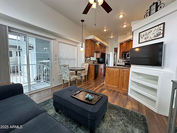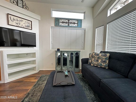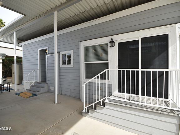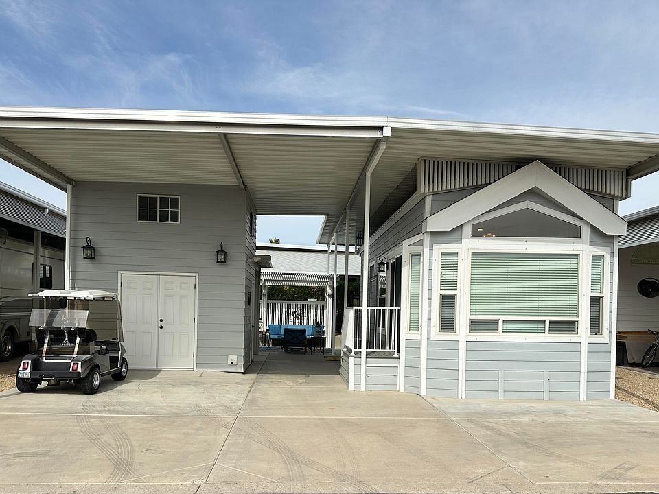 Welcome to your Dream Retreat! This charming park model home is the epitome of comfort and style. The 9'+ vaulted ceilings adorn the entire home with natural light. Engineered wood plank flooring throughout means beautiful style & easy cleaning. Kitchen features stainless appliances, upgraded natural wood 42'' cabinets & solid surface countertops. Gorgeous outdoor space has a built-in island, sink, tv and has the utmost privacy. Permanent shade structure covers the entire house & outdoor area. Huge Office casita has a full-size washer/dryer, a desk, an extra fridge, and an entire 2nd level for even more storage. As a resident of this community, you'll have guarded gate safety and access to an incredible array of amenities. Come see all that Happy Trails & Surprise have to offer.