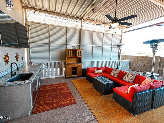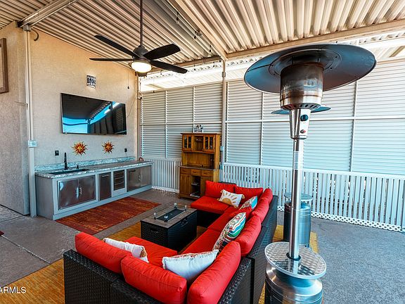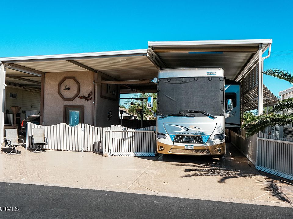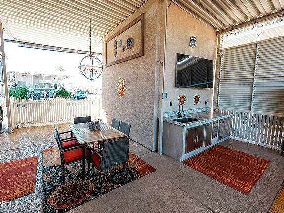 Enjoy effortless resort living on one of the nicest RV lots in Happy Trails Resort. A 14'6'' full cover and 4' fence provide shade and privacy, while the outdoor kitchen, cozy seating, and fireplace make it ideal for gatherings or quiet evenings. The two-story stucco casita includes a shower, toilet, and sink behind a charming barn door, plus a full-size washer/dryer, refrigerator, and upstairs loft for storage or hobbies. Thoughtful touches—sunshades, security lighting, furniture covers, and tasteful décor—add comfort and peace of mind. You'll own your lot and enjoy low HOA fees, friendly neighbors, and resort amenities like pickleball, golf, pools, and 100+ clubs. Pride of ownership shines throughout—just unpack, unwind, and start living the Happy Trails lifestyle.