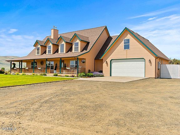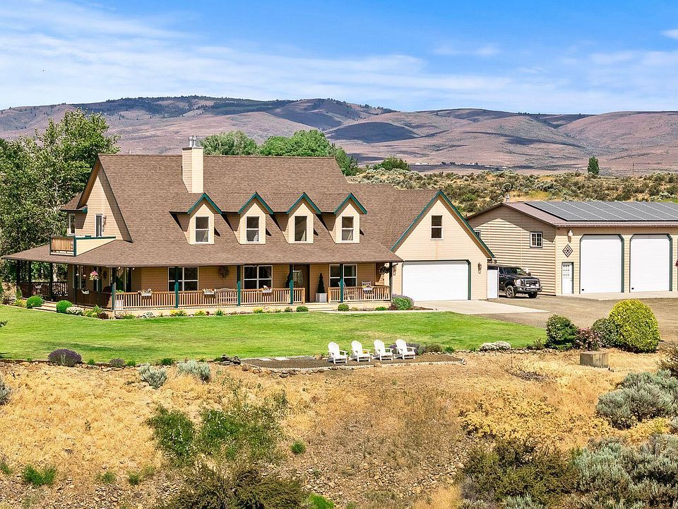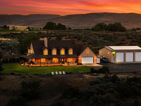 Perched on 23.8 acres and offering complete privacy, this stunning 4-bedroom, 3.5-bathroom residence showcases breathtaking views of the Yakima Valley to the East and South. Enjoy the panorama from your wrap-around deck or through the abundant windows in the spacious living room, centered around an impressive floor-to-ceiling double-sided rock fireplace. The kitchen features elegant quartz countertops and stainless steel appliances. Find two primary bedrooms--one conveniently located on the main level and another upstairs with its own fireplace and private deck. The upstairs primary ensuite boasts a fully tiled walk-in shower and luxurious jetted tub. Outside, discover a substantial 36'x 48' shop, energy-efficient solar panels, dog run, and RV hookups. For outdoor enthusiasts, the property includes its own shooting range. Additional 5 acre parcel with own well and septic available for purchase. Experience country living with valley views in this exceptional property.