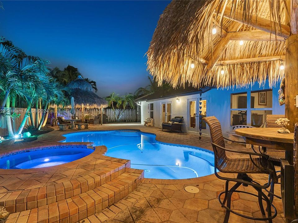 Discover tropical living at its finest! This 3/2 pool home is nestled in a highly desirable area, this stunning home offers a saltwater pool complete with a new pump, lighting, and a diamond-brite finish. The spacious, extended patio with fresh pavers invites you to relax under two tiki huts, creating the ultimate backyard oasis. Inside, impact windows ensure peace of mind, while the remodeled kitchen and bathrooms boast self-closing cabinets for a sleek touch. Enjoy year-round comfort with a disinfectant AC system, and the heated pool lets you indulge even in cooler months. Schedule your private showing today