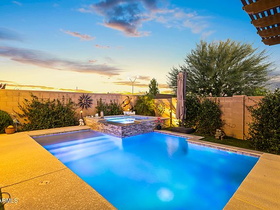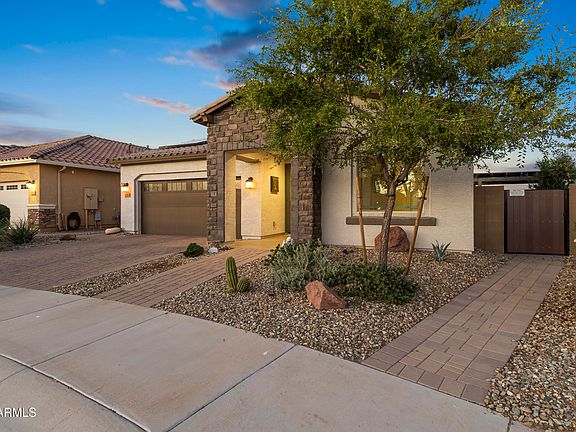 Welcome to Heritage at Asante, a premier gated 55+ community offering resort-style amenities including a clubhouse, pickleball courts, temperature-controlled pools, putting course, dog parks, and fitness centers. This beautifully maintained single-owner Kennedy floorplan by Lennar features 2 bedrooms plus a den and 2 bathrooms. The open-concept kitchen showcases rich brown cabinetry, quartz countertops, a gas range, stainless steel appliances, and ample storage space. The spacious great room and separate dining area provide the perfect setting for gatherings and relaxation. The primary suite offers peaceful backyard views and includes dual vanities, a walk-in shower, and a large closet that connects conveniently to the laundry room. Step outside to your private backyard oasis, complete with a sparkling pool and spa, paved covered patio with pergola, artificial turf, and mature landscaping. With no neighbors behind and solar panels for added efficiency, this home is a true gem.