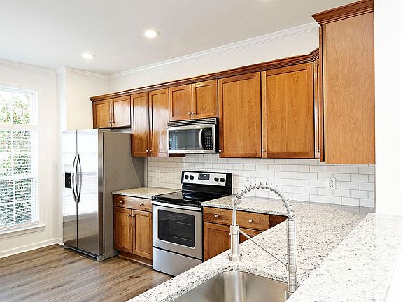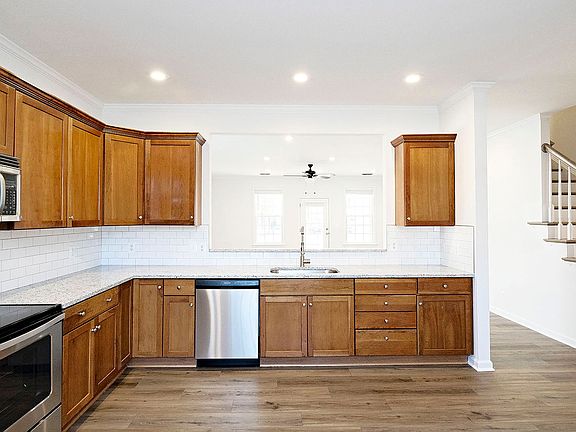Inside, this recently updated 1,642 sqft townhome features luxury vinyl plank flooring, high ceilings, and a light-filled, open layout on the main level. The spacious kitchen includes granite countertops, stainless steel appliances, and room for a movable island or small breakfast table. The adjoining dining and living areas are filled with natural light and accented by built-in shelving. A half bath completes the main floor.