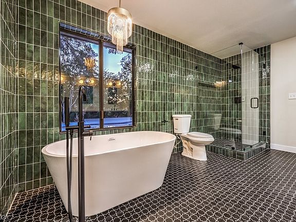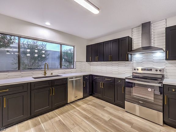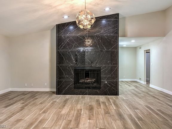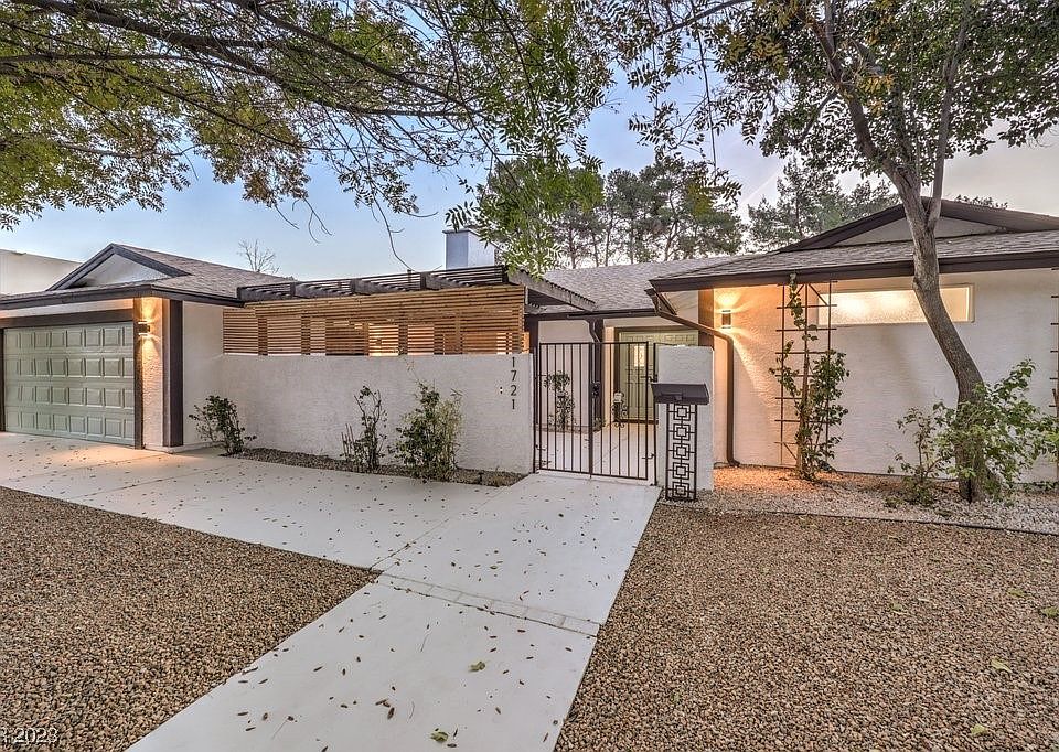 This is a rare find! Home has it all, vaulted ceilings, modern floor plan with spacious bedrooms (including 2 primary suites), large lot with RV parking, garage, pool, private backyard & gated courtyard, PLUS it has simply stunning custom finishes! Home has been thoughtfully upgraded with mid century modern details. Enjoy the exceptional downtown location, minutes to the Las Vegas Strip & Downtown Las Vegas! Design features include: wood slat courtyard wall, grand chandeliers, floor to ceiling porcelain fireplace, custom tile work in bathrooms & kitchen, and sleek black fixtures throughout! Gorgeous primary bathroom has a standalone garden tub, full tile wall with double vanity (including a vanity area with space for a stool). Plenty of storage space throughout, including the kitchen. Gorgeous quartz counters, new cabinets, and tiled backsplash. Lots of privacy in the backyard with mature landscape!