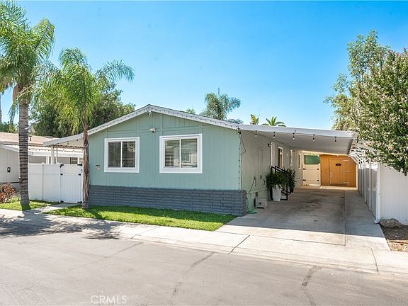 Moving-in ready home in the Redlands Ranch Family Park – Fully Renovated 3-Bedrooms plus optional flex room that can be used as a 4th bedroom. Bonus room shows ceiling fan and closet. This stunning home offers a modern, open-concept design and extensive high-end upgrades like, new metal stud framing on half the home and a new open interior layout. Stylish sidelight front door with Smart Lock Touch & Wi-Fi Deadbolt (fingerprint scanner) and smart switches. Vinyl rigid flooring throughout with updated baseboards and door trims. New AC condenser and ducts for comfort year-round. Newer tankless water heater, Fresh exterior paint, new carport awning, and extended driveway (fits 4 cars) New cement around the lot and built-in storage shed with lighting & independent breaker. Completely upgraded 100 Electrical Panel. Kitchen comes with: Quartz countertops and white shaker cabinets, pot filler above the stove and full backsplash. Soffit ceiling in kitchen and dining area with pocket lighting. Alexa smart recessed lighting throughout, plus eyeball lights in the living room. Bedrooms: Ceiling fans in all 3 bedrooms and bonus room. Spacious master suite with walk-in closet. Master bath: modern renovation with freestanding soaker tub & LED niche, LED Bluetooth mirror, floating sink vanity, frameless glass shower, and tower shower-head with jets. Hallway bath: fully renovated with frameless shower, floating vanity with storage, and LED mirror. Laundry Room, comes with white shaker cabinets & sink for convenience. Community Amenities: Sparkling swimming pool and welcoming clubhouse. This home comes with HOA and Space Rent. Located minutes away from the Redlands University, Downtown Redlands, Dinning and Freeway.Won't Last!!