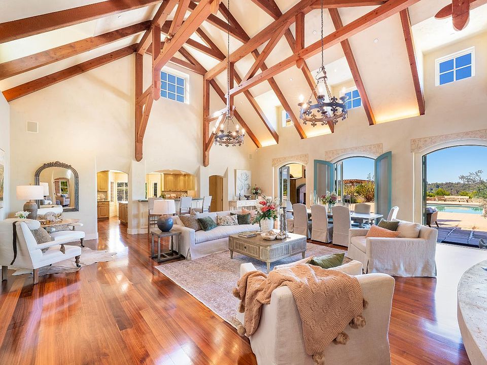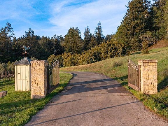 Discover this stunning European villa with French influences, now offered for the first time! Nestled on 5.5 acres and surrounded by coastal redwoods and stunning vineyards, this custom-built masterpiece is a true sanctuary. Enter through a double-gated, paved driveway to find tranquility and privacy. The estate features 2.5 acres of meticulously maintained Pinot Noir and Chardonnay, leased long-term to Joseph Phelps. Inside, the single-story residence boasts 23-foot ceilings with custom open beams, creating an inviting atmosphere. French doors open to a spacious patio, ideal for alfresco gatherings. The open-concept layout includes a chef's kitchen with high-end appliances, ample cabinetry, and generous counter space. This elegant home offers 2 bedrooms and 2.5 bathrooms, adorned with walnut floors and plaster walls. Exquisite coffered ceilings enhance the ambiance. A charming second unit with a full bath and kitchenette, plus a versatile cottage, provide additional living space or creative opportunities. Unwind by the stunning inground pool, overlooking the Freestone valley and rolling hills, where unforgettable sunsets await. This exceptional property is truly turnkey ensuring a seamless transition to your new lifestyle. Elevate your wine country living today!