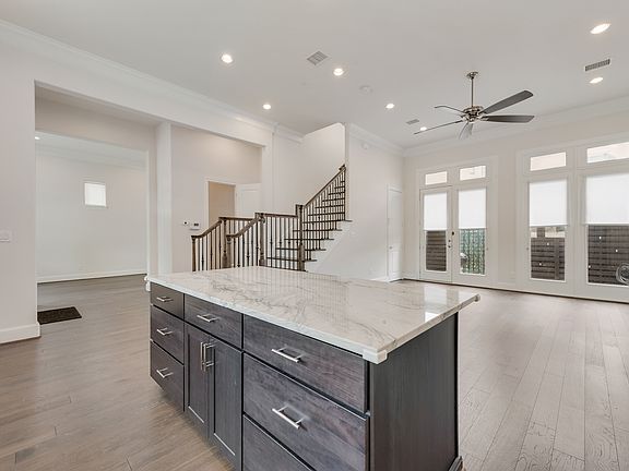 Welcome to this beautifully designed three-story home offering style, functionality, and comfort. The first floor features wood flooring throughout, an inviting open-concept living and dining area with tall ceilings, abundant natural light, and a sleek clean looking kitchen with a large island, granite countertops, stainless steel appliances, and plenty of cabinet space. A convenient half bath is also located on this level. On the second floor, you'll find all bedrooms, including a grand primary suite with an ensuite bath spa-inspired bathroom showcasing a soaking tub, separate glass-enclosed shower, dual vanities, and an oversized walk-in closet. Secondary bedrooms are generously sized with great closet space. The third floor is a true retreat and comes complete with a bonus living area, a full bath, and access to a huge private balcony perfect for entertaining or relaxing. Additional highlights include hardwood flooring in main areas, modern lighting, and energy-efficient windows throughout. The washer and dryer is located on the second floor. You can choose gas or electric for your dryer. Outside, enjoy a private patio area plus a covered balcony. HOA maintains the front lawn, giving you low maintenance living at its finest. This home combines modern elegance with a smart floor plan, making it perfect for those who love to entertain while still enjoying cozy private spaces. Close to I-75 for the best navigation for any commute to work, entertainment, shopping and dining.