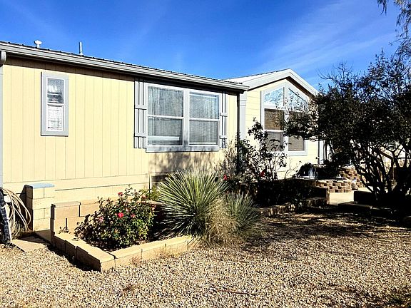 Spacious 2003 CAVCO home with stunning mountain views and a unique primary suite featuring dual master bathrooms and dual walk-in closets. Property includes a carport, steel garage, two bunkhouse structures for guests or workshop space, a newer metal roof, newer flooring, and an additional A/C unit ready to be connected. Numerous improvements throughout. Plenty of room for horses and other animals. Interior features a generous dining area, built-in entertainment center, and a laundry room with pantry storage and newer gas appliances. Move-in ready with a private well (Reg. #55-203154)