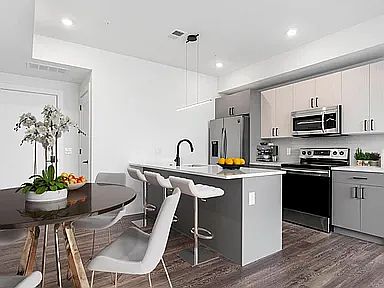 Experience sophisticated city living in this beautifully designed, modern unit, offering luxury finishes and exceptional amenities. The residence features sleek, dark wood style flooring throughout and an abundance of natural light thanks to oversized windows, with some rooms offering stunning skyline views of the city center. The bathroom showcases impressive design with a walk in glass shower featuring a dramatic black and white tile design, a contemporary vanity, and matte black fixtures.