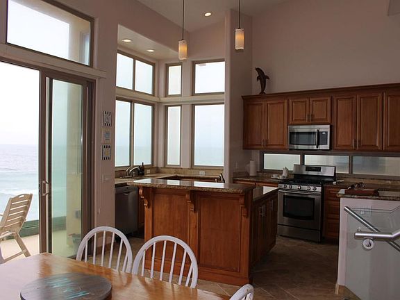 A seldom-used split-level beach house built in 2012 on South Pacific Street is a rare opportunity for one lucky buyer. Modern design with thoughtful touches throughout includes all ensuite bedrooms, bonus room with full kitchen on beach level, three fireplaces, primary bedroom with spacious bathroom suite including two separate water closets, sunken jetted tub, separate shower, lots of storage, and walk-in closet. Ocean view deck from the primary with bonus area off bedroom. Built to suit elevator shaft. Two laundry hookups on each floor. Spiral staircase to bonus deck with 360 views. Large two car garage with sink and cabinet space could accomodate golf cart in tandem on one side. Outdoor shower and deck. Not built to string line - lots of room to grow here!