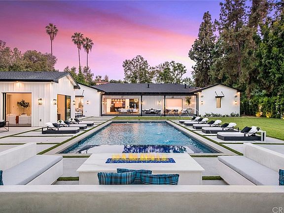 Welcome to this brand new sprawling, single-story, cape cod stunner located south of the blvd in highly sought after Old Rancho Estates. Enter your dream behind exclusive gates with lush landscaping on a supremely private lot. The grand foyer invites you through the extremely sophisticated open floor plan, offering the most quintessential LA lifestyle. Harmonious natural light pours in throughout large Fleetwood pocket doors surrounding the entertaining areas. Beautiful boasting family room effortlessly flows into the gourmet chef's kitchen featuring state of the art appliances, two center islands, and a butler's pantry- adjacent, the elegant dining room provides the entertainers dream with indoor/outdoor lifestyle. Master suite is the epitome of refinement with spectacular scale, design, high-quality finishes, and utmost attention to detail. Pocket doors leading to the serene outdoor lounge offers an exclusive resort-like feel. Substantial master bath showcases luxurious walk-in shower, soaking tub, and two extraordinary walk-in closets. Custom ensuite bedrooms are designed for subsequent comfort and privacy. The backyard oasis- unmatched in every way, is perfect for daytime and nighttime hosting. Gorgeous gleaming pool/spa surrounded by basketball court, built-in lounge with fire pit, pool cabana, guest house, built-in bbq, and plenty of lounge space. Additional amenities include home theater, laundry room, indoor bar, fireplaces, office, bonus room, and so much more.