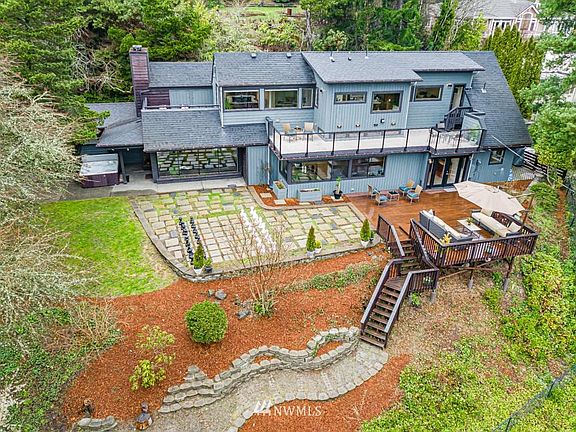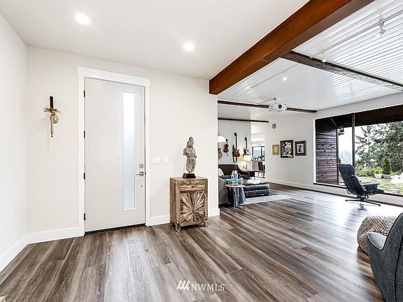 Architect Zen McManigal masterpiece marries midcentury & modern vibes for the perfect abode. Thoughtful floorplan anchored by stunning kitchen/dining w/sunny bistro area, wet-bar, & pantry. Main level laundry, junior suite w/1/2 bath, large 2nd bedroom w/built-ins, hall bath, & open Great Room w/wood burning fireplace, home theater & vistas of Rainer & the Sound, all opening to hot-tub, patio, lawn, view deck, treehouse & fire-pit. Upper level has primary suite (w/private rooftop deck, sumptuous 5pc spa bath & walk-in closet w/its own laundry hook-ups) on one end, a den area in the middle, a home office or guest bedroom on the other & a 2nd rooftop deck. 2car garage w/shop + 1car garage + carport + parking + RV hookups + turnout. Party on!