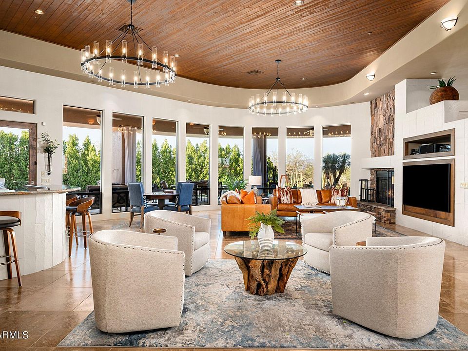 Outdoor showerBrand-new poolFull officeKitchen with mountain viewsCustom barVibrant entryGorgeous dining room