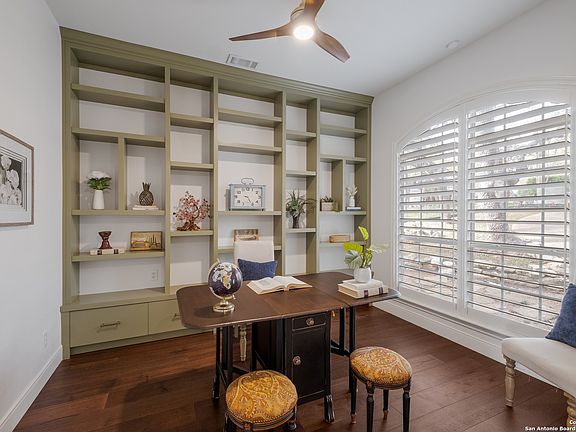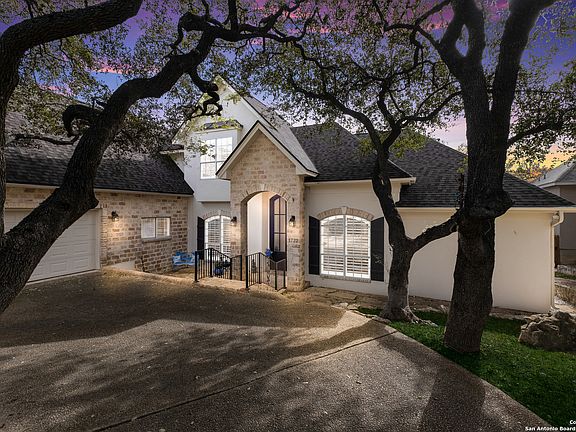 Nestled in the prestigious neighborhood of Deerfield, this exquisitely updated home blends timeless elegance with modern comfort. From the moment you arrive, the striking stone accents, fresh exterior paint, and circular driveway set the tone for the sophisticated living that awaits inside. Step through the grand double iron doors, and you'll be greeted by a breathtaking sightline straight to the lush greenbelt behind the home. Large windows bathe the interiors in natural light and ensure uninterrupted views of the serene landscape. Designed for both comfort and entertaining, the expansive open-concept living, dining, and kitchen area features a gorgeous stone fireplace, custom Spitfire ceiling fan and designer lighting from Lighting Inc. The fully remodeled kitchen is a chef's dream, boasting updated cabinetry, a spacious island, sleek stainless steel appliances, a stylish backsplash, and a matching butler's pantry. A custom Acacia center island adds warmth and charm, while upgraded doors, lighting, and hardware throughout elevate the home's luxurious feel. Many of the fixtures and hardware were meticulously selected from Ferguson specialty plumbing store. The dedicated office, just off the entry, features built-in bookshelves, plantation shutters, and abundant natural light, making it an ideal workspace. Meanwhile, the completely remodeled primary bath offers a spa-like retreat with a deep soaking tub, oversized walk-in shower, double vanity, and a 21-inch high toilet for ultimate comfort. The iron front doors and railings come with a 20-year warranty. The covered patio has been enhanced with cedar wood paneling and cooling ceiling fans. Additional updates include a custom side door in the laundry room, epoxy-coated garage flooring, and HVAC, water heater, and water softener-all replaced in 2022. Located inside the 1604 loop, this prime location ensures an effortless commute to anywhere in the city, including airport just 12 minutes away. The Deerfield community offers an unparalleled lifestyle with a swim team, pickleball and tennis courts, a community park, and year-round neighborhood events. Plus, with excellent security patrol and direct access phone lines, peace of mind is guaranteed. This is where your next chapter begins!
