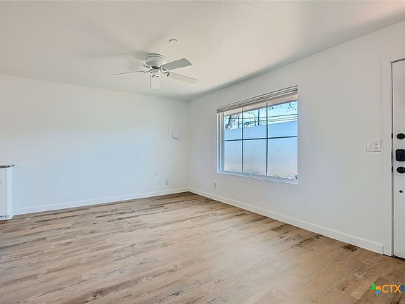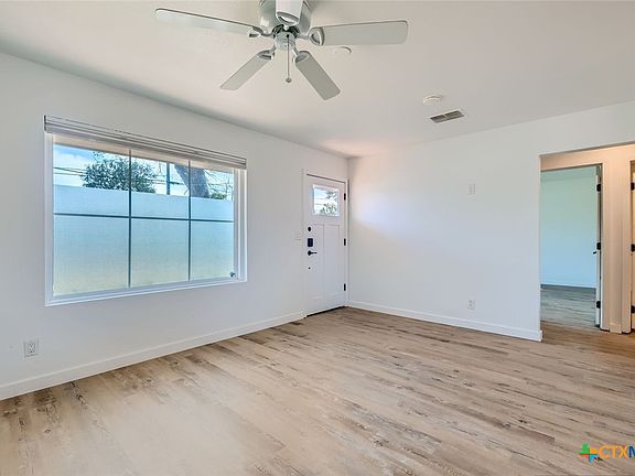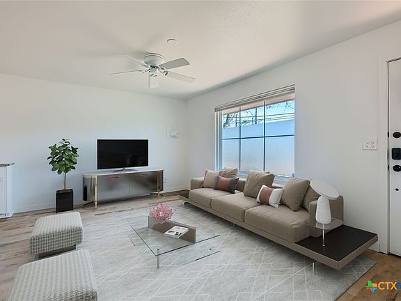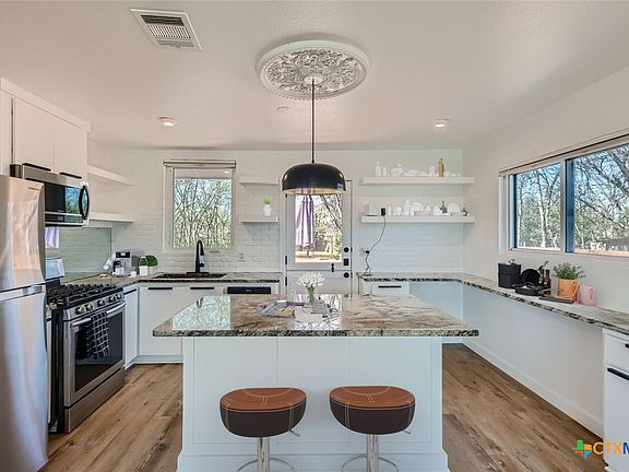 Beautifully updated from top to bottom, this modern-farmhouse cottage offers style, comfort, and thoughtful upgrades in a prime New Braunfels location. The exterior features all-new Hardie siding, energy-efficient Andersen windows, and a cheerful blue door that sets the tone for the inviting interior. Inside, you'll find a bright open layout with brand-new subflooring and durable wood-look flooring throughout. The kitchen boasts granite countertops, stainless-steel appliances, open shelving, and a custom Dutch door leading to the backyard. Enjoy outdoor living at its best on the expansive deck with a covered pergola, bar seating, and room to gather under the trees. The reinforced concrete silo foundation has been leveled for peace of mind, and the fully fenced yard offers privacy and space to relax. Conveniently located near downtown New Braunfels, Landa Park, and the Comal River-this home blends modern design with Hill Country charm.