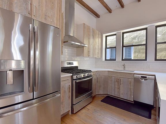 Exposed brick wallsCaesar stone waterfall islandLarge skylightSoaring beamed ceilingsLuxury architectural upgradesTree-lined streetReclaimed barn wood cabinetry