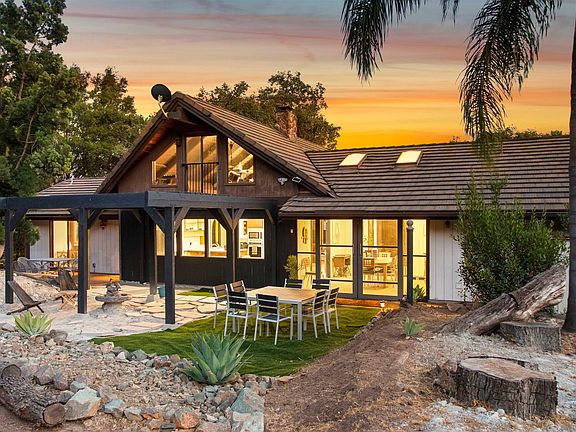 Welcome to Your Private Country Escape! This charming custom built ranch style home is tucked away on a picturesque, tree-canopied private road, offering the perfect blend of rustic tranquility and modern convenience. With two separate dwellings situated on a generous 4.01 acre parcel and a new paid off solar system, this home is a rare opportunity! The main home features soaring open-beam, tongue-and-groove ceilings, a stunning stone fireplace, and expansive windows that flood the living space with natural light and frame beautiful backyard views. A unique spiral staircase leads to a versatile loft—ideal for a home office, hobby room, or private retreat. All three bedrooms offer generous space with 12-foot-wide, floor-to-ceiling closets. The dining area opens to a covered patio—perfect for alfresco dining and enjoying peaceful evenings under the stars. The spacious kitchen boasts abundant counter and cabinet space, with panoramic views of the surrounding mountains and natural landscape. A detached guest house includes an attached garage, currently configured as an open-air workshop—ideal for creative projects or extra storage. Set on a gentle, horse-friendly lot, the property includes a work/storage shed, and offers ample space to add an additional residence/ADU, pool, or equestrian facilities. A large front deck and expanded parking area makes this the ultimate entertaining space. Bring your toys—there's room for your RV, boat, horses, and more!