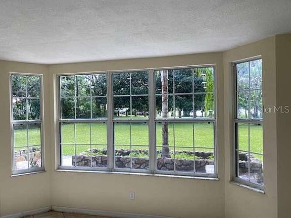 Pond in the backyardLarge oak treesPorcelain ceramic diagonal tileHardwood flooringStone columnsWrought iron fence