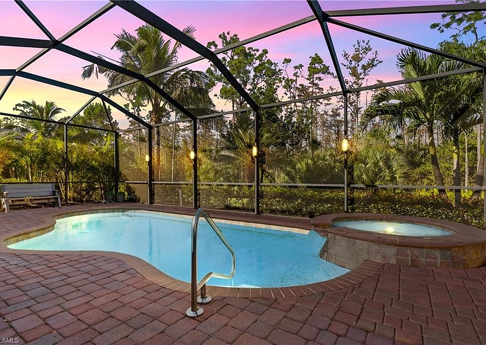 ELEGANTLY DESIGNED “ANGELINA” MODEL WITH SALTWATER POOL/SPA, OUTDOOR KITCHEN & PEACEFUL PRIVATE PRESERVE VIEWS! This magnificent home comes with a SOCIAL MEMBERSHIP and offers 3 bedrooms, 2 Full Baths, 2 Car Garage, 2,062sf living area. The residence is situated on a homesite that provides the best of both worlds… Enjoy LANDSCAPED/WOODED VIEWS FROM THE LANAI and SHIMMERING LAKE VIEWS from the front of the house/guest bedroom. This home was designed with a layout that's conducive for entertaining. The lanai showcases SEALED pavers, TONGUE-N-GROOVE WOOD CEILING, stone wall & custom OUTDOOR KITCHEN complete with a stainless steel grill, vented hood, refrigerator & storage compartments. Unwind after a long day in the HEATED SALTWATER POOL & SPA while enjoying the private lush landscaping and PRESERVE views. The pool cage is accented by PILLAR LIGHTS and landscape up lighting, perfect to set the evening ambiance. Inside the home, the OPEN CONCEPT living area provides a beautiful entertaining space with a gorgeous FIREPLACE FEATURE WALL complete with built in LED ELECTRIC FIREPLACE and ILLUMINATED SHELVES. The spacious Greatroom/Dining area boasts TRAY CEILINGS, WOOD TRIM ACCENTS and sight lines with NO OBSTRUCTIONS. The kitchen boasts timeless WHITE SHAKER STYLE CABINETRY, granite countertops, a large island, built in stainless steel appliances, desk area & a passthrough window to the outdoor living space. The kitchen cabinetry has DOVETAIL CONSTRUCTION with 42-inch upper cabinets enhanced by a WHITE SUBWAY TILE BACKSPLASH & UNDER-CABINET LIGHTING for an upscale, designer look. Throughout this home, you’ll find sophisticated lighting/ceiling fans, CROWN MOLDING & ALL HARD SURFACES (NO CARPET). The primary suite provides pool & peaceful private views along with direct lanai access. It is outfitted with SHADES, TRAY CEILING & dual walk-in closets with WHITE CLOSET ORGANIZERS. The luxurious bathroom features granite countertops, dual sinks, VANITY area, SOAKING TUB & a WALK-IN SHOWER with HEAVY GLASS. The two guest bedrooms provide guests ample space to stay. Closets are equipped with CUSTOM ORGANIZERS for storage. The Guest Bath is enhanced by a HEAVY GLASS ENCLOSURE. Laundry is complete with cabinetry and sink. The garage comes with epoxy paint floor and CABINETRY for added storage. Have peace of mind during storm season with IMPACT-RESISTANT windows and doors. Bonita National Golf & Country Club is in Flood zone X (no flood insurance required) & centrally located, just a short drive to the Gulf beaches, Airport, upscale shopping, 5th Avenue, Coconut Point Mall, Miromar Outlets, & the exciting upcoming Midtown Bonita! Bonita National offers an impressive array of amenities including an on-site restaurant & bar, resort-style pool, lap pool, spa, upcoming pickleball courts, tennis, fitness center, clubhouse, beauty salon, & 24-hour guard at gate. Social members can play unlimited golf from May-October! *Furniture package available for separate purchase.