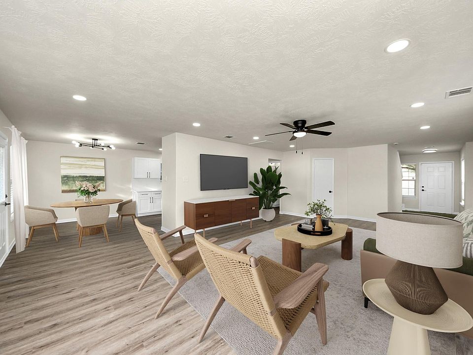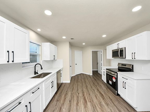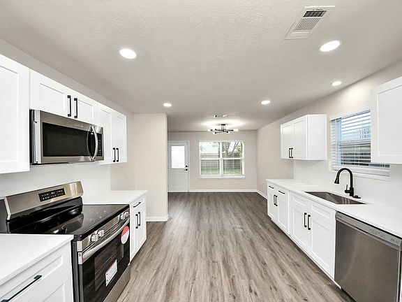 Step into refined elegance with this fully renovated 4-bedroom, 2.5-bath home offering 2,300 sq ft of modern luxury just off Hwy 290 in Hockley. Inside, a sophisticated color palette balances crisp whites with bold black accents, seen in matte black faucets, door hardware, and cabinet pulls. The kitchen shines with quartz countertops, custom white shaker cabinets, and a striking black tile backsplash. Designer light fixtures and contemporary mirrors elevate each space, while sleek wood-look flooring flows seamlessly throughout. Bathrooms feature vessel sinks, modern vanities, and black-framed glass shower doors for a spa-like touch. Spacious living areas and a thoughtfully designed layout offer both style and functionality. A perfect blend of form and function, this home is move-in ready and meticulously finished.