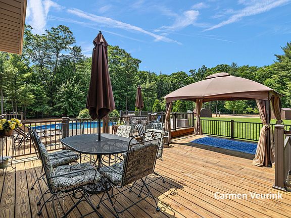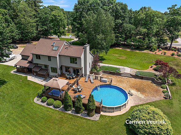 Your dream oasis awaits! Discover unparalleled outdoor living on this stunning 5-acre estate. Imagine summer days by the 24-foot above-ground pool, surrounded by a massive three-tiered deck with new powder coated railings—your ultimate entertainment hub! The impeccably maintained grounds showcase mature landscaping and serene wooded trails at the back of the property, inviting you to explore nature right in your backyard.