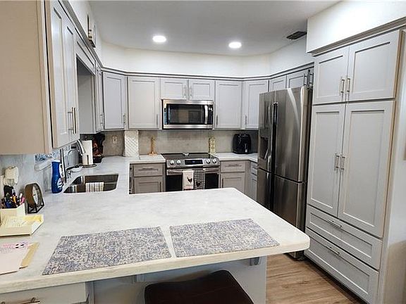 One-of-a-Kind home in a certified 55+ Community Truly unique and the only one like it in the area! This beautifully renovated 1,471 sq. ft. home features a distinctive Southwest-style exterior and a bright, open-concept interior. The spacious living room boasts high decorative ceilings, floor moldings, and a wood-burning fireplace. Enjoy a large dining area and a newly updated kitchen with stainless steel appliances, quartz countertops, new cabinet doors, and ample pull-out storage. The primary suite includes an on-suite bathroom and access to the enclosed sunroom. Bedroom two sits near the fully updated bath with a step-in tiled shower. The sunroom could serve as a second living area, craft room, or third bedroom. Outside features low-maintenance landscaping with artificial grass, a cozy pergola under a mature oak, a storage shed, and a two-car garage with a remote-controlled screen door. Updated in neutral tones, this home is move-in ready and waiting for your personal touch.