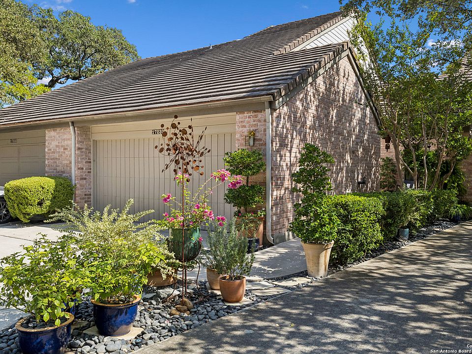 This jewel box of a condo is truly one of a kind-beautifully curated, effortlessly stylish, and completely move-in ready. Featuring 2 bedrooms and 2 full baths, this lock-and-leave home impresses from the moment you step inside with soaring vaulted ceilings and abundant natural light, creating a warm, sophisticated space that feels both timeless and fresh. Enjoy a private courtyard entry and a rare, fully enclosed deck surrounded by lush landscaping-your own secluded retreat for morning coffee or evening relaxation. A spacious 2-car garage provides convenience and additional storage, a standout feature in condo living. Set within the sought-after Canyon Creek Village, this serene community is known for its mature trees, lush green spaces, and peaceful atmosphere. Tucked away just off Blanco Road inside Loop 1604, it offers the perfect balance of privacy and convenience-close to everything yet quietly removed from the bustle. Residents enjoy access to a sparkling pool, tennis courts, and a welcoming clubhouse, along with easy proximity to top-rated dining, shopping, and everyday amenities. With its charm, functionality, and unbeatable sense of style, this is without question one of the cutest condos on the market.